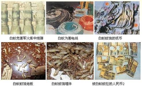 白蟻還能危害圖書(shū)、文物、織物、武器、帳冊(cè)、錢(qián)幣、地下電纜等,造成重大損失。古廟宇的大梁被蛀斷,地下通訊電纜被蛀造成電信中斷,銀行金庫(kù)也難以幸免,人民幣被蛀等。